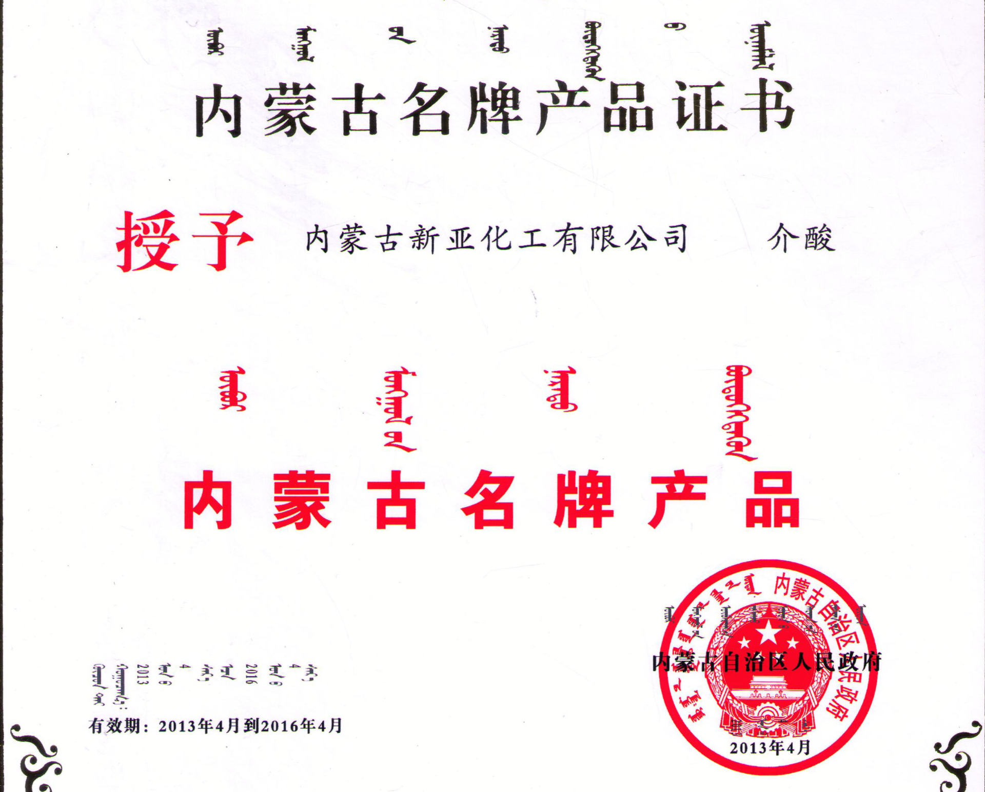 內(nèi)蒙古名牌產(chǎn)品證書